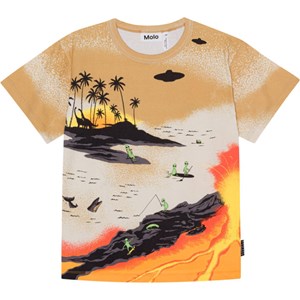 Riley is a t-shirt in 100% organic cotton with a allover print of an alien that has brought some friends along. They are having a great time, doing different activities in a landscape of palm tree islands and fire-breathing volcanos. The small aliens are bright green against a yellow, orange and sand coloured background. This t-shirt has a round neck with a rib edge, a print on the front and is in a loose fit.