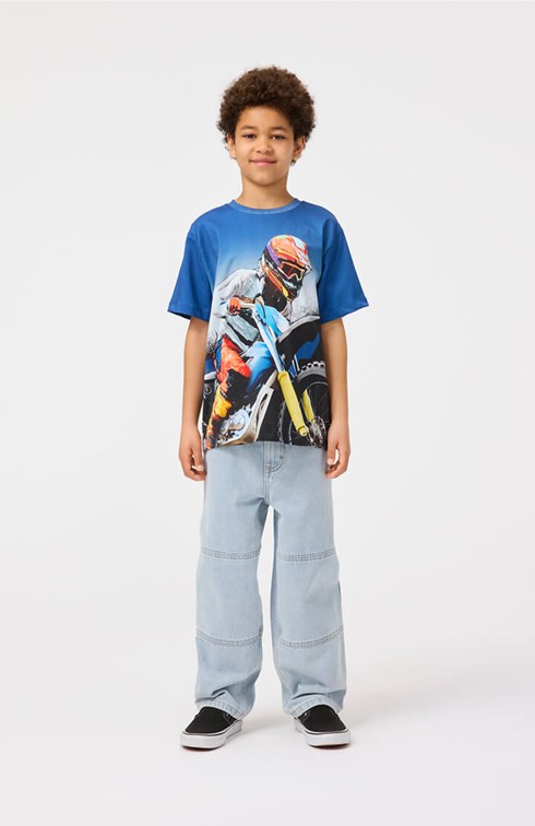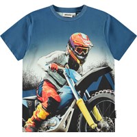 Blue t-shirt in soft organic cotton with short sleeves and ribbed neckline. The t-shirt has a loose fit and a front and back print of a motocross rider.