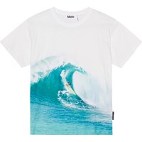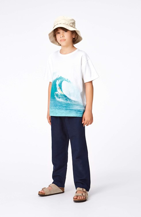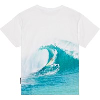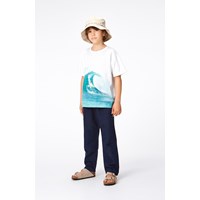 Riley is a white t-shirt in 100% organic cotton with a placement print on the front and back. The print is of a cool surfer who is riding a huge wave. This t-shirt has a round neck with a rib edge and a loose fit.