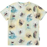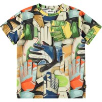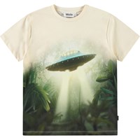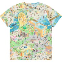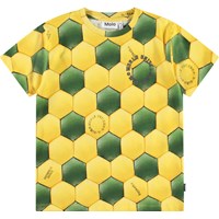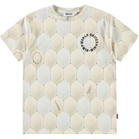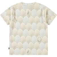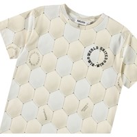 Beige t-shirt in soft organic cotton with short sleeves and ribbed neckline. The t-shirt has a loose fit with an all-over print of the pattern on a football in light grey and beige colours.