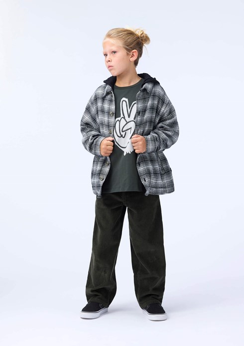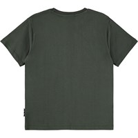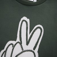 Dark green T-shirt made of soft organic cotton with short sleeves and a ribbed neckline. The T-shirt has a loose fit with a front print of a hand peace sign.