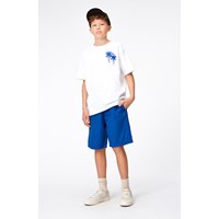 Riley is a white t-shirt in 100% organic cotton. There is a small, blue palm tree print on the front that gets repeated in a larger size on the back. If you look closely, you'll probably see a hidden, 'More Love' message. Riley has a round neck with a rib edge and is in a loose fit.