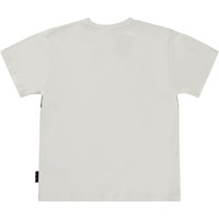 White t-shirt with a pangolin print on the front. The small pangolin is hanging upside down off of a branch while it greets a blue butterfly. This t-shirt is constructed in 100% cotton, has short sleeves, a round neck with rib and is in a loose fit.