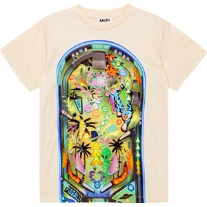 Riley is a beige t-shirt in 100% organic cotton with a placement print on the front. There is so much to see on this pinball print, like a ball in a frenzy of lights, aliens, palm trees and cool tigers. Riley has a round neck with a rib edge and is in a loose fit.