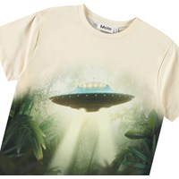 Off-white t-shirt in soft organic cotton with short sleeves and ribbed neckline. The t-shirt has a loose fit with a front print of a UFO in the jungle and the sun's beautiful rays.