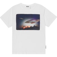 Riley is a white t-shirt in 100% organic cotton with a placement print. The print shows a visit from far away. Not just one but three UFO's look like they are landing at the edge of a forest. Maybe they are just vacationing on Earth? Riley has a round neck with a rib edge and is in a loose fit.