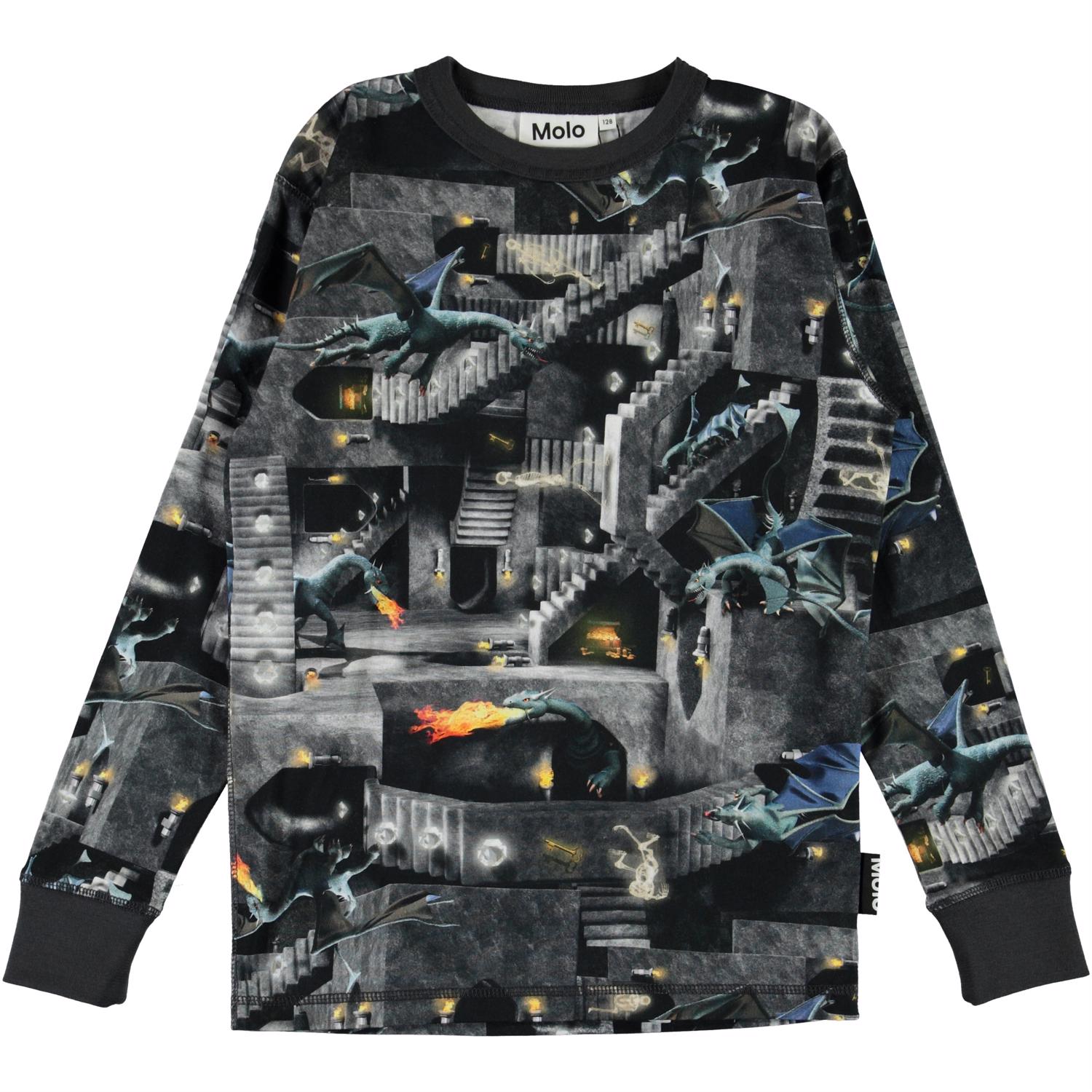 Rill is a long sleeve t-shirt with a print of dragons in a computer game. Rill has a dark grey edge tape at the neck and dark grey rib at the sleeves.