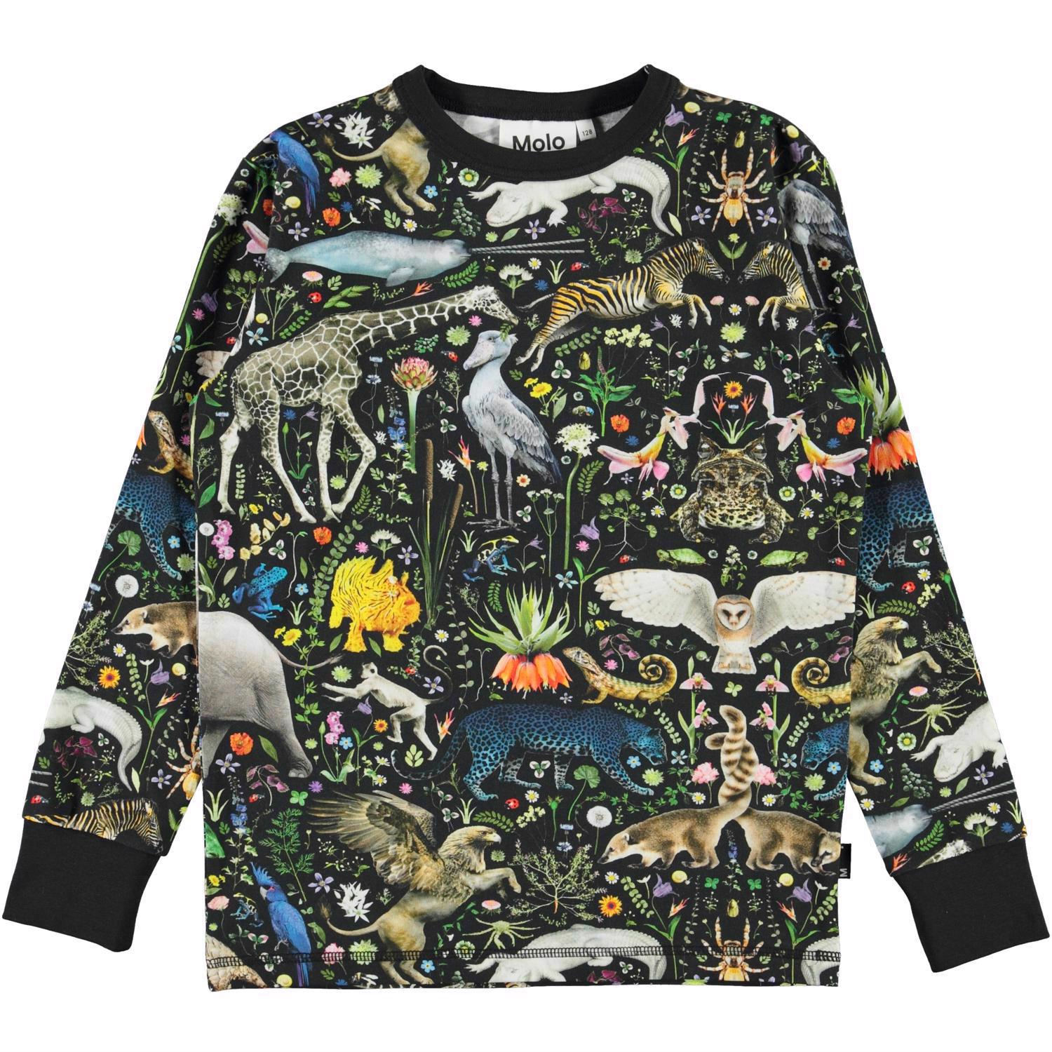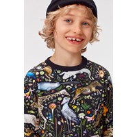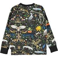 Rill is a long sleeve t-shirt with the "Faunatastic" print, which shows all sorts of flora, fauna and fantasy animals. There's a vulture with an eagle head and a lion body, a cunning blue cheetah on the hunt, white crocodiles, owls, narwhal whales with two tusks and an abundance of exotic flowers. Rill has black rib at the neck and sleeves.