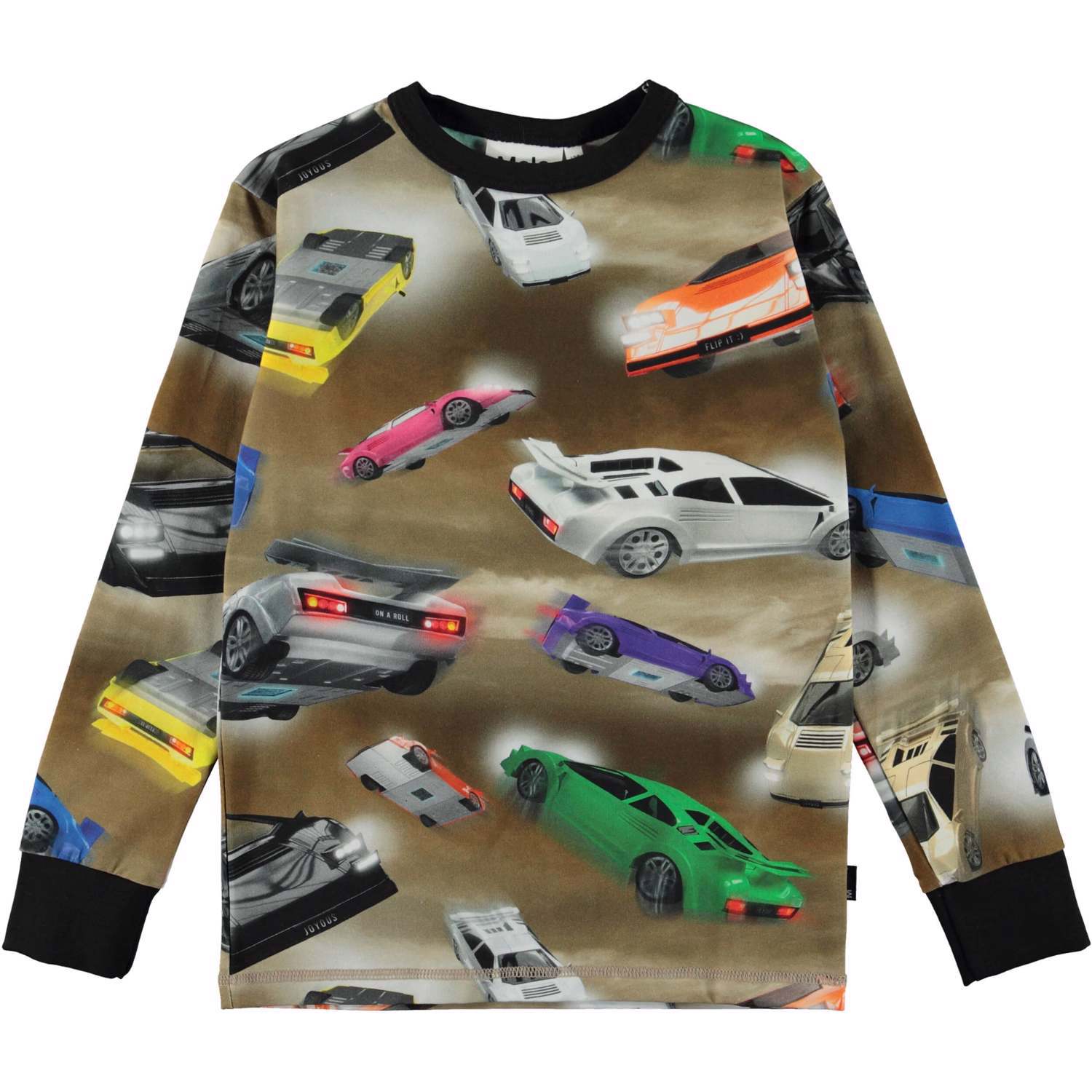 Rill is a long sleeve t-shirt in the "Flip It" print. It shows incredibly fast race cars that are moving so quickly that some of them have flipped on their heads. The cars are racing each other on Rill, which has black rib at the neck and sleeves.