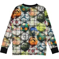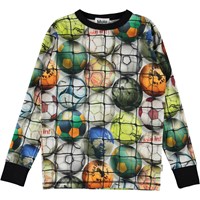 Rill is a long sleeve t-shirt with a print of colourful footballs behind a net. Rill has a black edge tape at the neck and black rib at the sleeves.