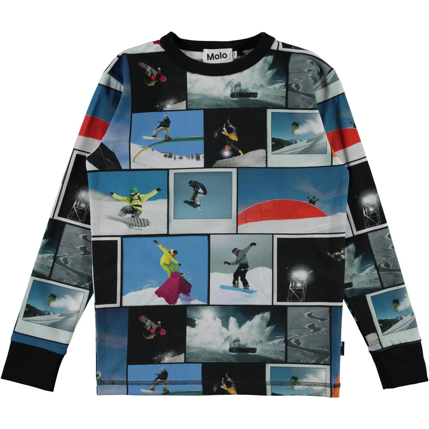 Rill is a long sleeve blue t-shirt with an all-over print of cool snowboarders. Rill has a black edge tape at the neck and sleeves.