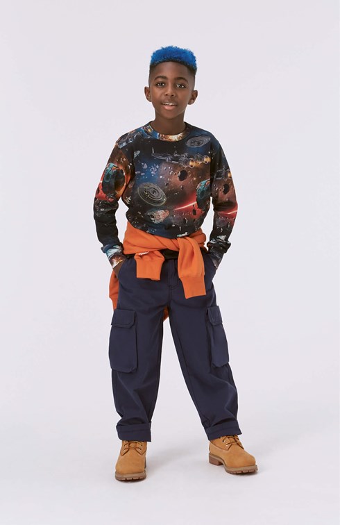 Black and dark blue, long sleeve t-shirt in an all over space print in a retro vibe. In space, with its clear, wild colours, there's fun everywhere you look. We get to follow adventurous spaceships and UFO’s that are looking for excitement in the asteroid belt. This t-shirt is in 100% organic cotton and has a round neck with a rib edge and rib at the sleeves. It is in a regular fit.
