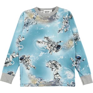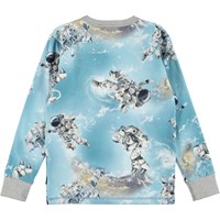 Rill is a long sleeve light blue top with a print of astronauts that are flying around in space. The top has a grey rib edge at the neck and sleeves.