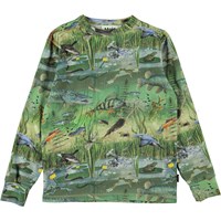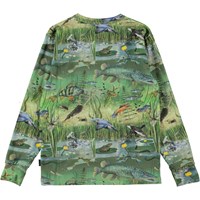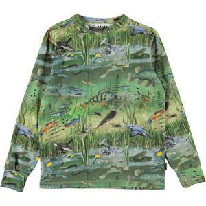 Rill is a green, long sleeve t-shirt with a print that shows life in and around a pond, where birds, fish and creepy-crawlies life side by side.