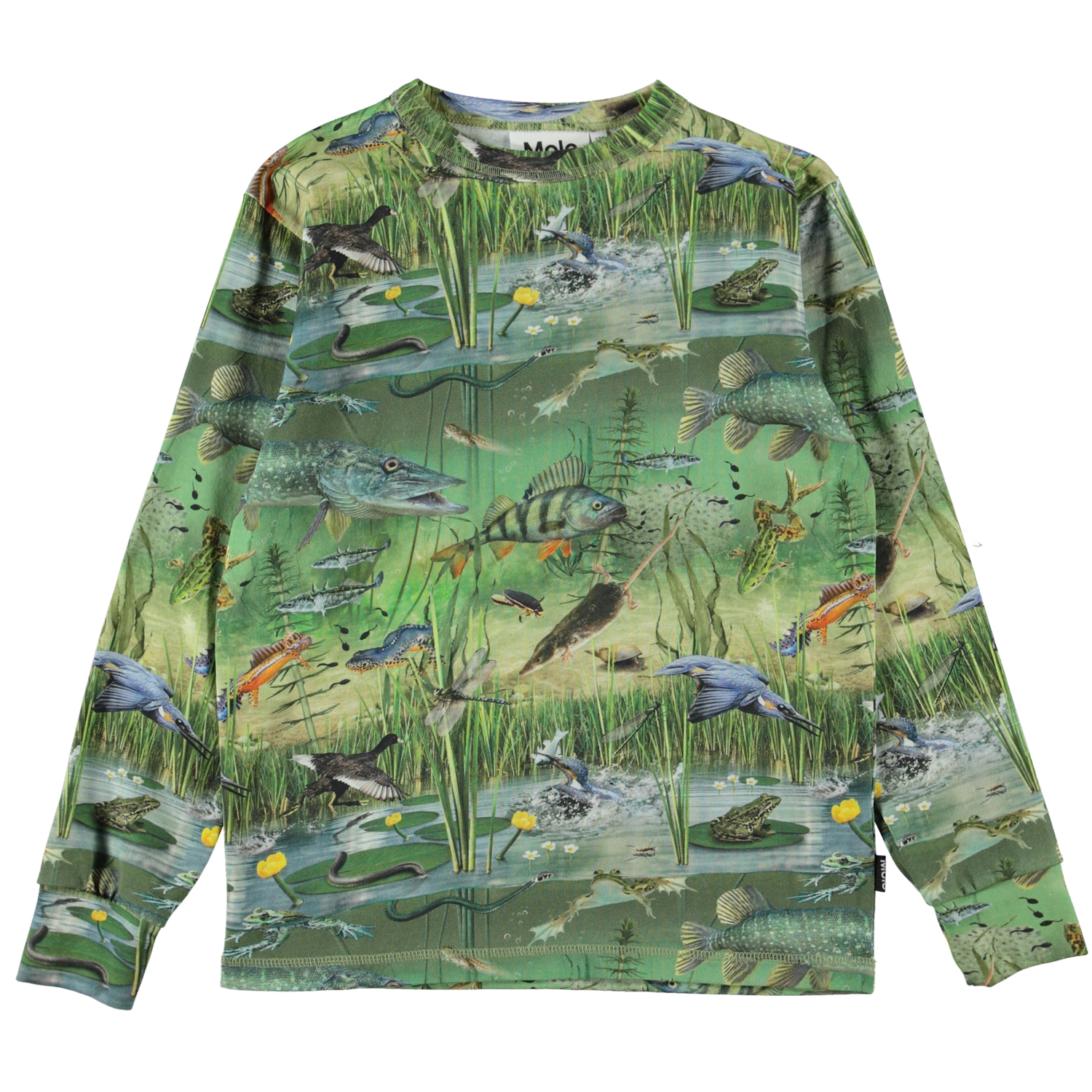 Rill is a green, long sleeve t-shirt with a print that shows life in and around a pond, where birds, fish and creepy-crawlies life side by side.