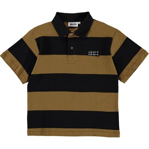 Rilloz is a polo t-shirt with a black collar and wide stripes in brown and black.