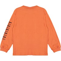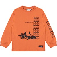 Rin is an orange long sleeve t-shirt with a race car print and the text "Past, present, future" on the front and text on one sleeve.