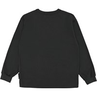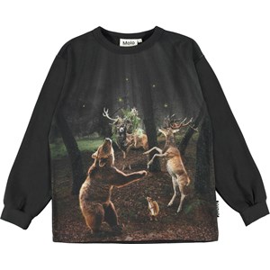 Rin is a long sleeve black top with a print of a bear, a squirrel and two red deer that are dancing in the forest.