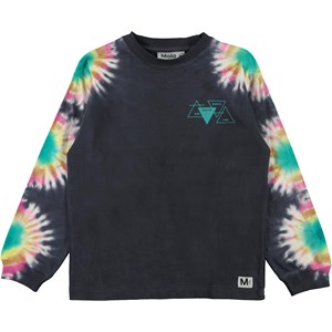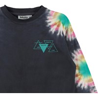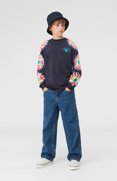 Rin is a long sleeve blue top with a colourful tie-dye print on the shoulders and the sleeves.