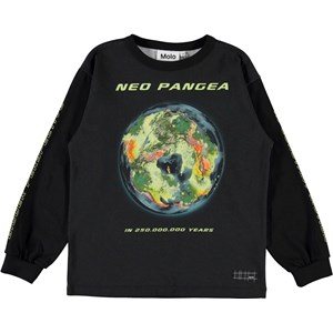 Rin is a black long sleeve top with a print of planet Earth on the front and the printed text 'Bigger perspective' on both sleeves.