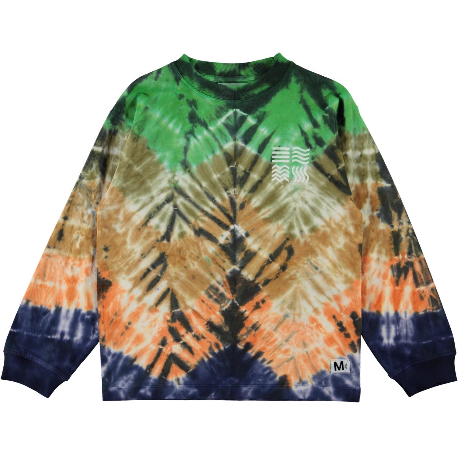Rin is a long sleeve top with a tie-dye zigzag print with a blue bottom and a green top.