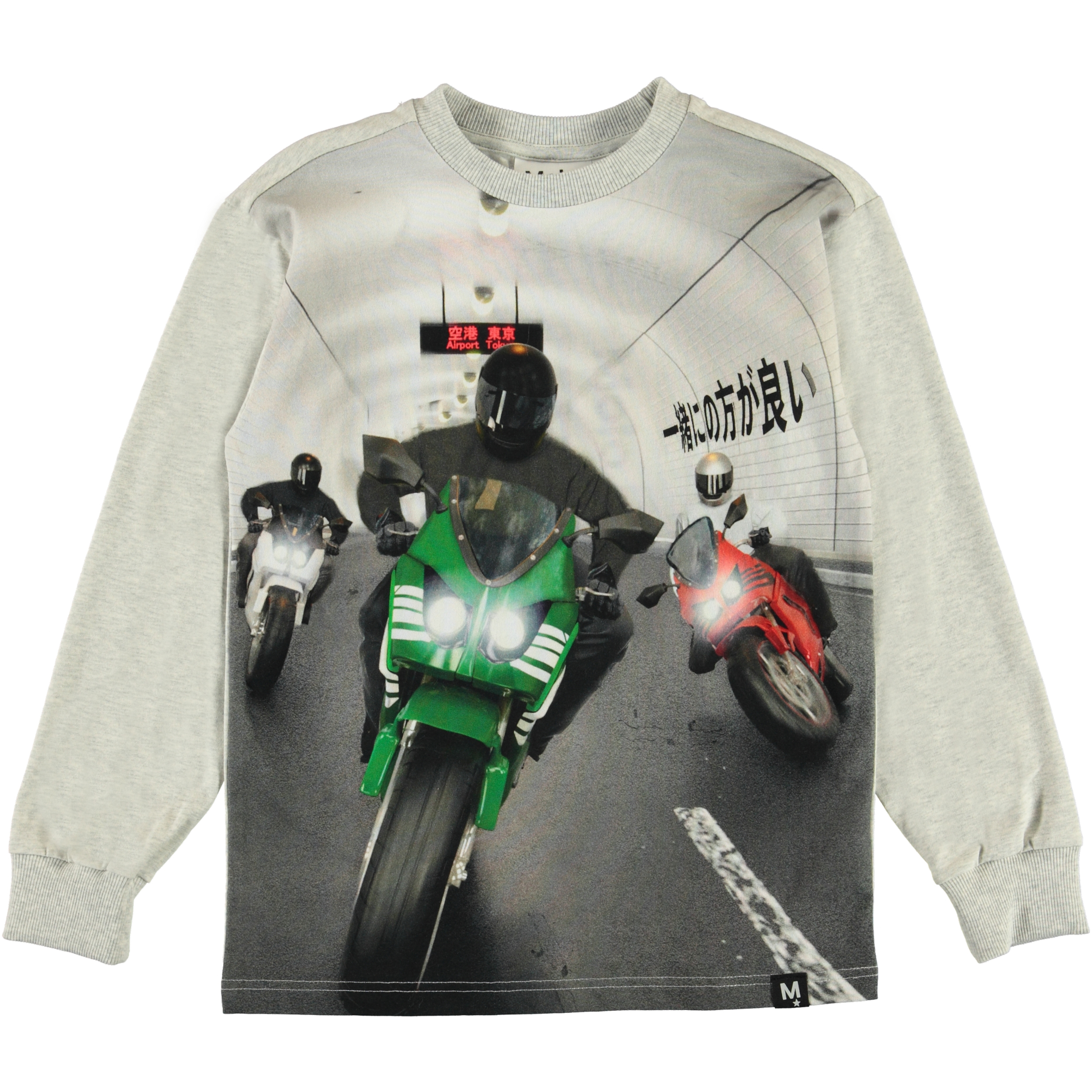 Things move quickly on the Risci top when motorcycles race each other on the 'Tunnel Bikers' print. The top is in grey cotton and has long sleeves.