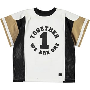 Ritter is a black and white t-shirt with sports references. Ritter has a wide, loose fit and has "Together we are 1" printed on the front.