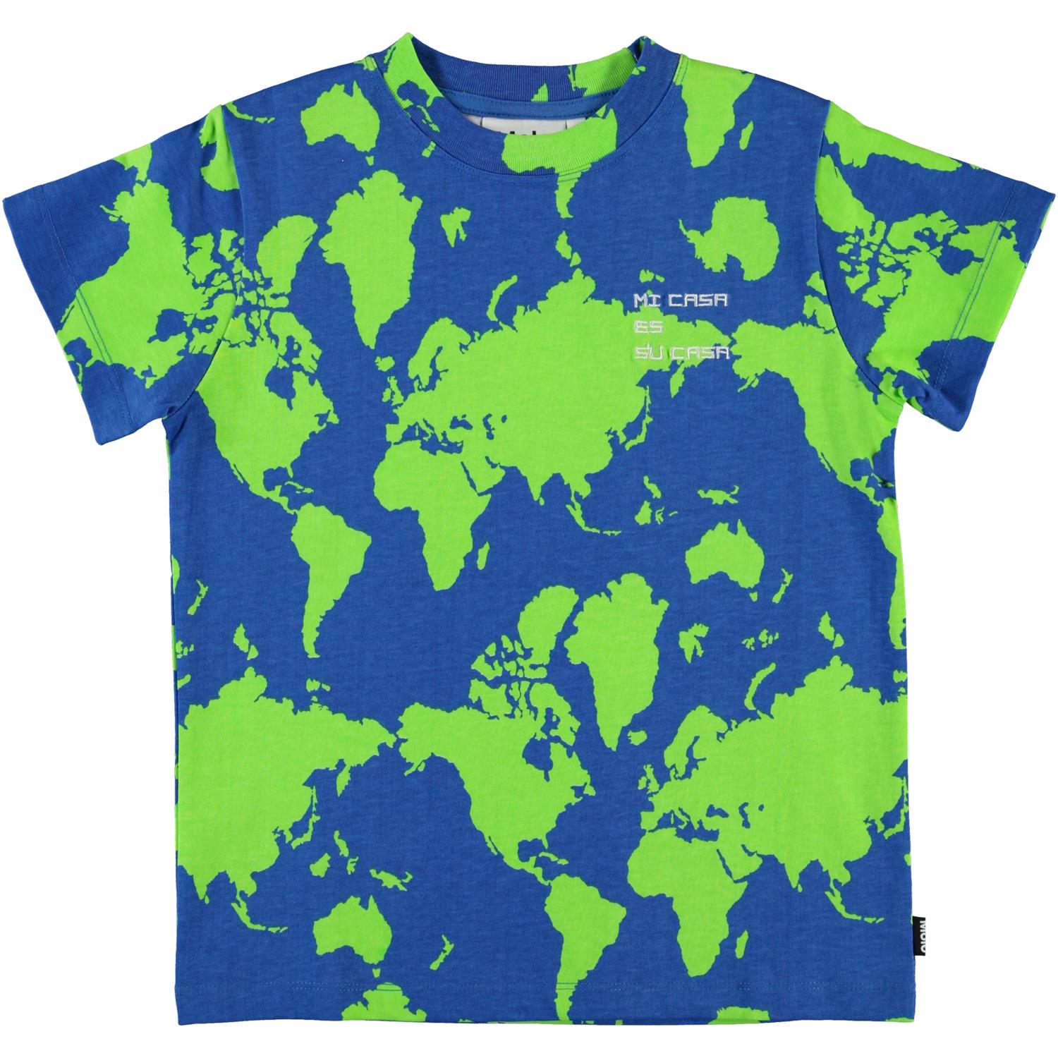Road is a t-shirt with a map of the world print in blue and green with the text 'Mi casa es su casa' on the chest.