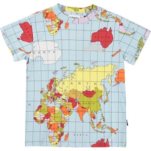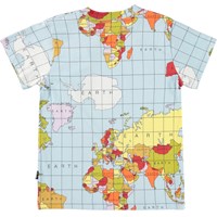 Road is a light blue t-shirt with a print of the map of the world in wonderful colours.