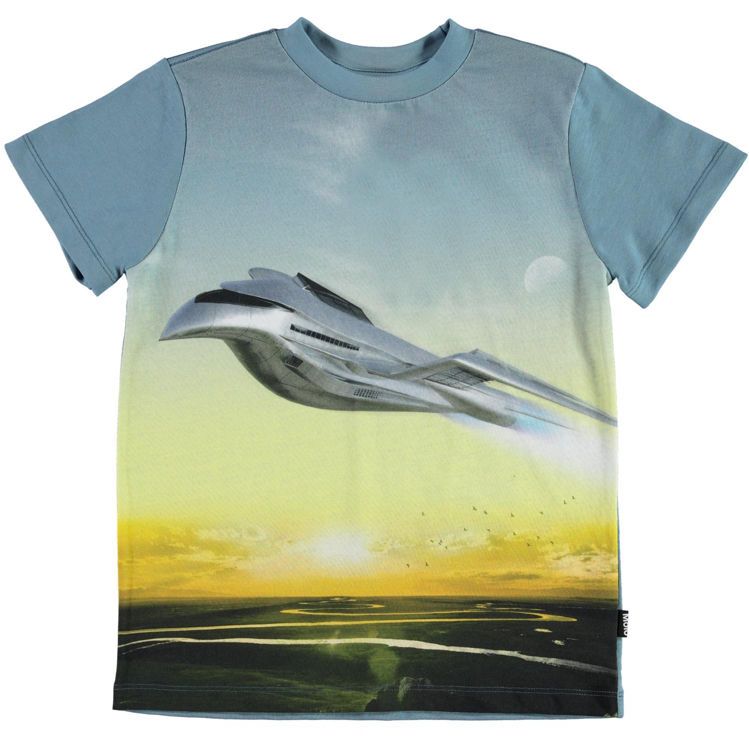 Road is a light blue t-shirt with a print of a futuristic airplane on the front.