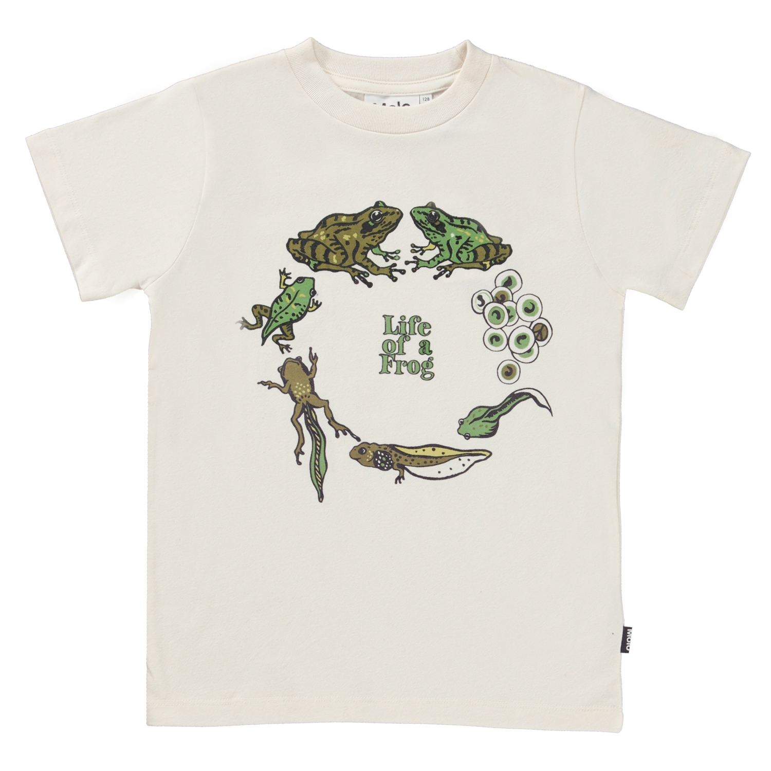 Road is an off-white t-shirt with a print of a frog's life cycle, from egg to tadpole to frog.