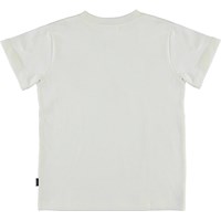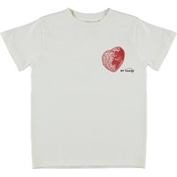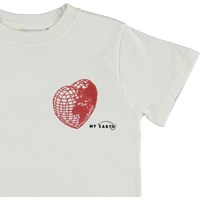 Road is a white t-shirt with a print of a red heart that looks like planet Earth, with the text: 'My earth'.