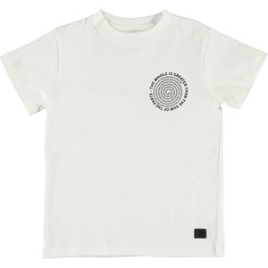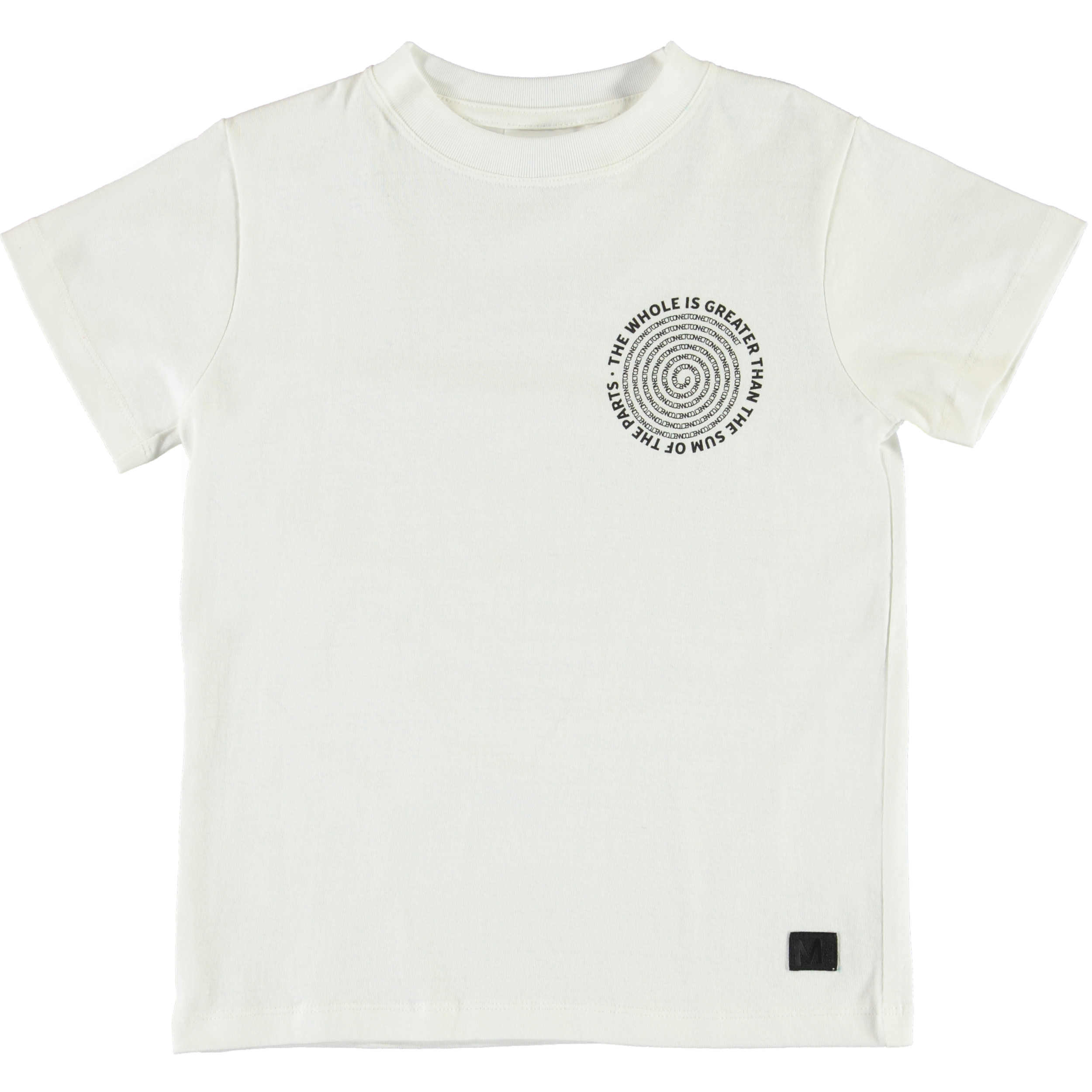 Road is a white t-shirt with a printed spiral text on the front and back. The wonderful message in the spiral is: "The whole is greater than the sum of the parts".