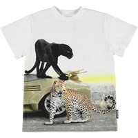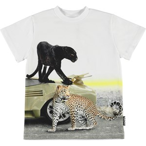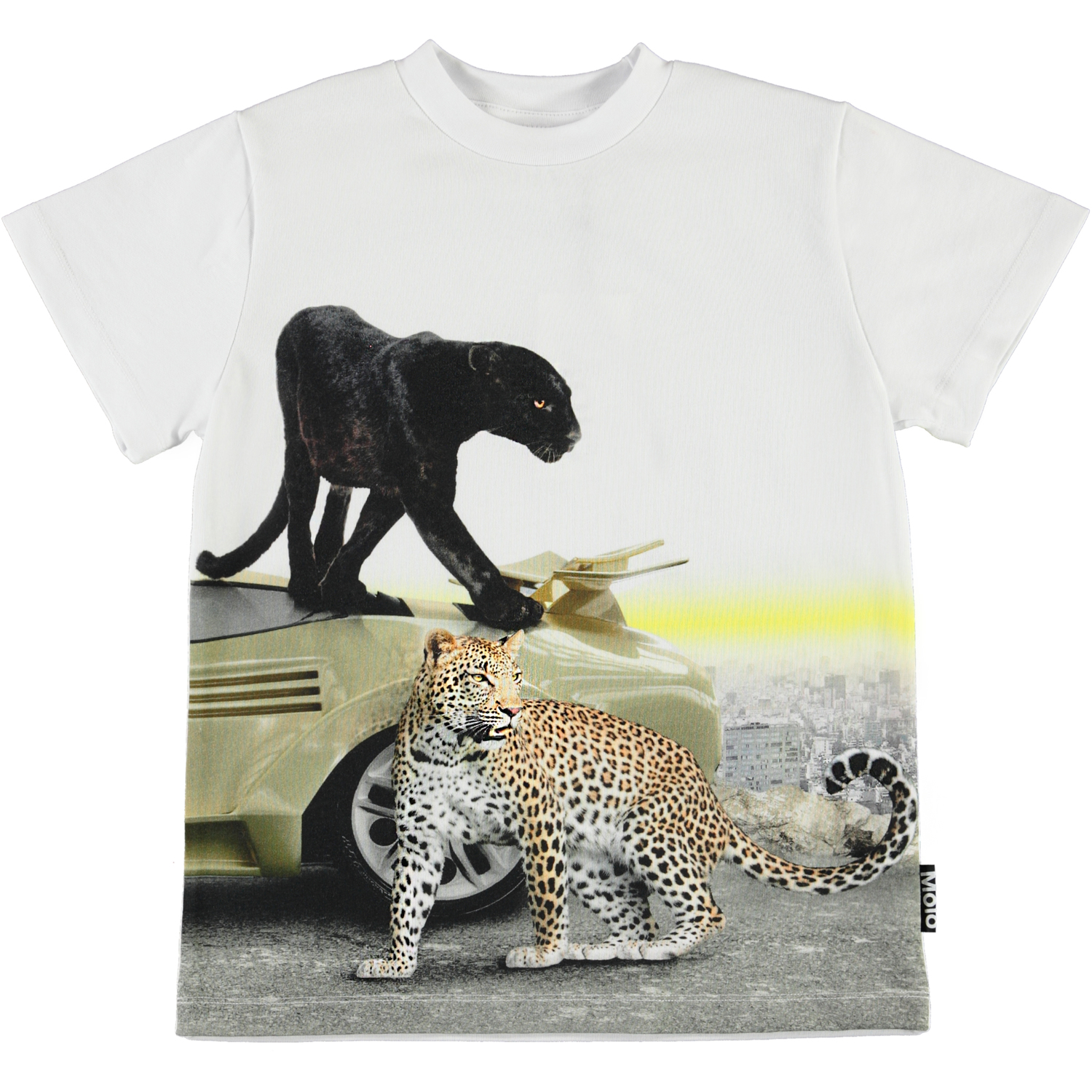 On the Road t-shirt with the "Wild City" print, you see a panther and a leopard that have made it to the city and have found a fast sports car to race around in, or maybe they'll just lounge in it.