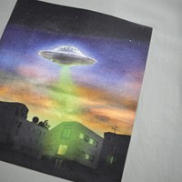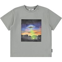 Grey T-shirt made of soft organic cotton with short sleeves and a ribbed neckline. The T-shirt has an oversized fit with a front print of a UFO, lighting up over the rooftops.