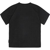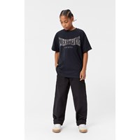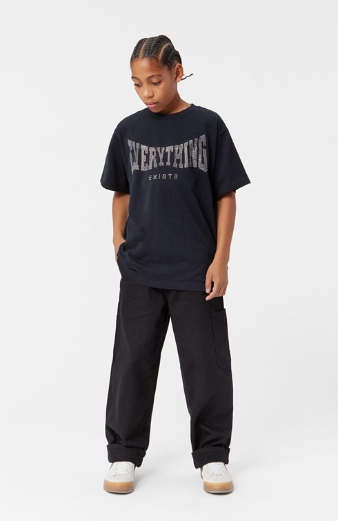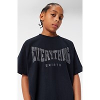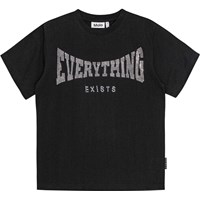 Black T-shirt made of organic cotton with short sleeves, round neckline, and ribbed hem. The T-shirt has an oversized fit and a printed text on the front that says "Everything Exists" made of rhinestones.