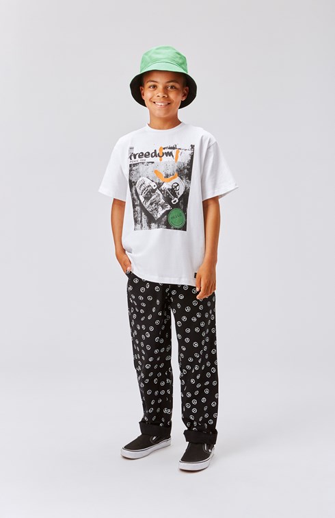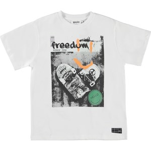 Rodney is a white t-shirt with a print of a broken skateboard that creates a heart shape and has the text 'freedom' written on it. The t-shirt has a boxy fit.
