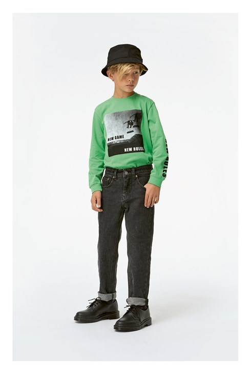 Rogert is a cool, green top with a skater print on the front with the text 'New game - New Rules' on the front and the sleeves.