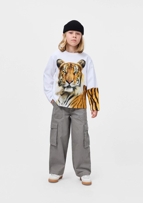 White sweatshirt made of soft organic cotton with a ribbed neckline. The sweatshirt has a loose fit with a print of a tiger that continues onto the sleeve and around the back.