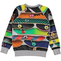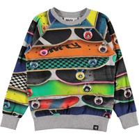 The Romeo top has a stacked skateboard print and grey rib at the sleeves and bottom.