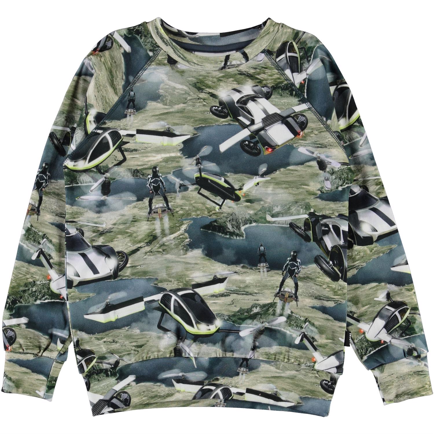 Romeo is a top with a print of futuristic flying cars. Romeo has raglan sleeves and rib at the bottom and on the sleeves.