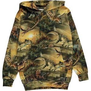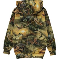 Green hoodie in an all over dinosaur print. The print shows many different dinosaurs, wandering around in the sand dunes in the pre-dawn mist. The outline of the moon hangs over them, reminding them that they are part of something bigger. This hoodie is constructed in 100% cotton. The hoodie has long sleeves, a hood, wide rib at the sleeves and bottom, a pouch pocket on the front and is a regular fit.