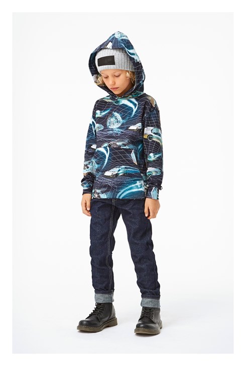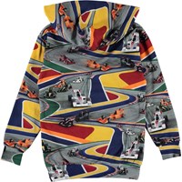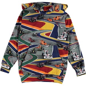 Romo is a hoodie with a pouch pocket in a colourful, all-over race car print called 'Full Speed'.