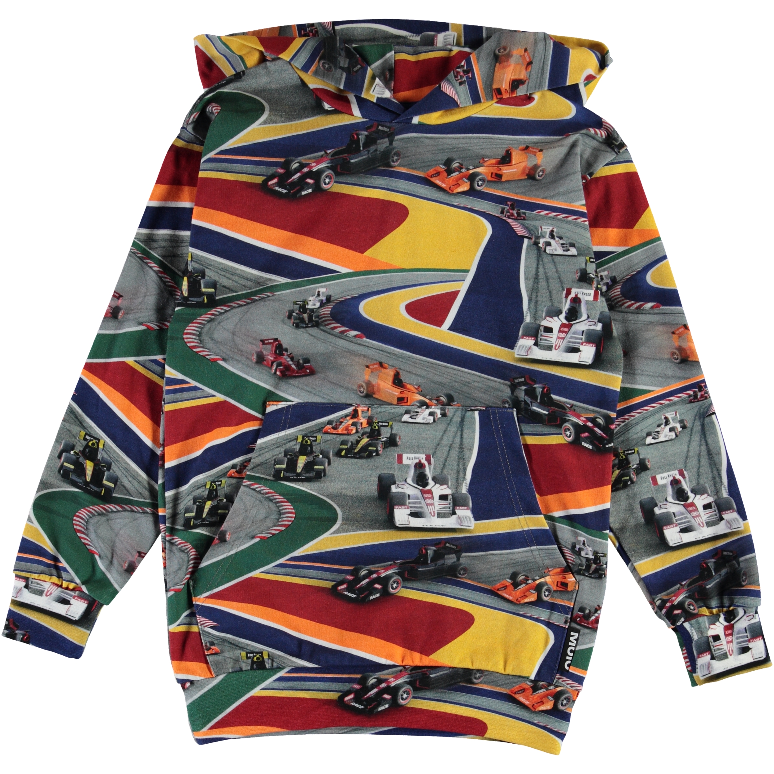 Romo is a hoodie with a pouch pocket in a colourful, all-over race car print called 'Full Speed'.