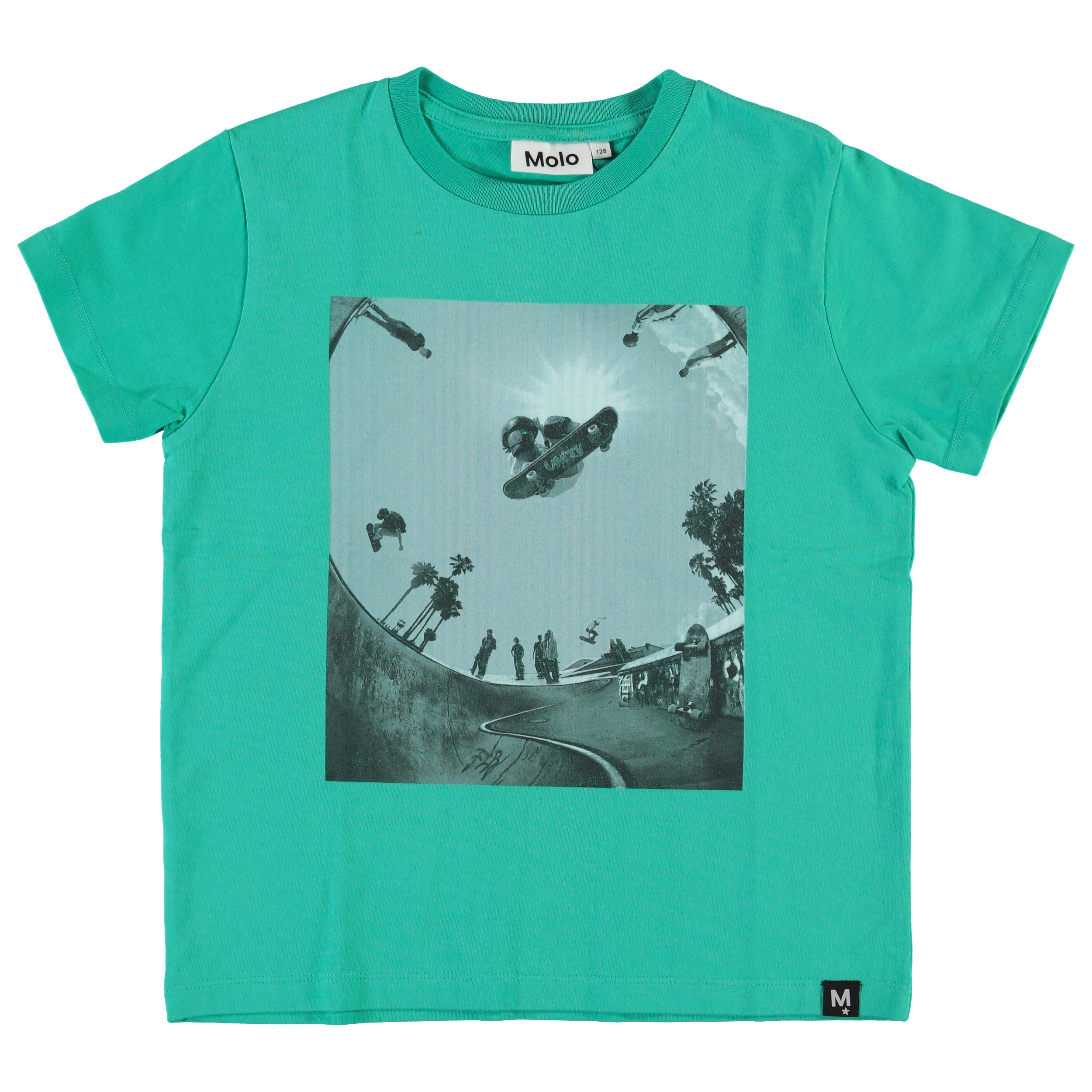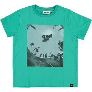 Roxo is a turquoise t-shirt with a skate print on the front.