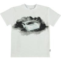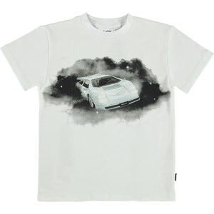 Roxo is a white t-shirt with the "Cars'n'Stars" print. On it, you can see a white race car flying around in dreams on a black cloud among the stars.