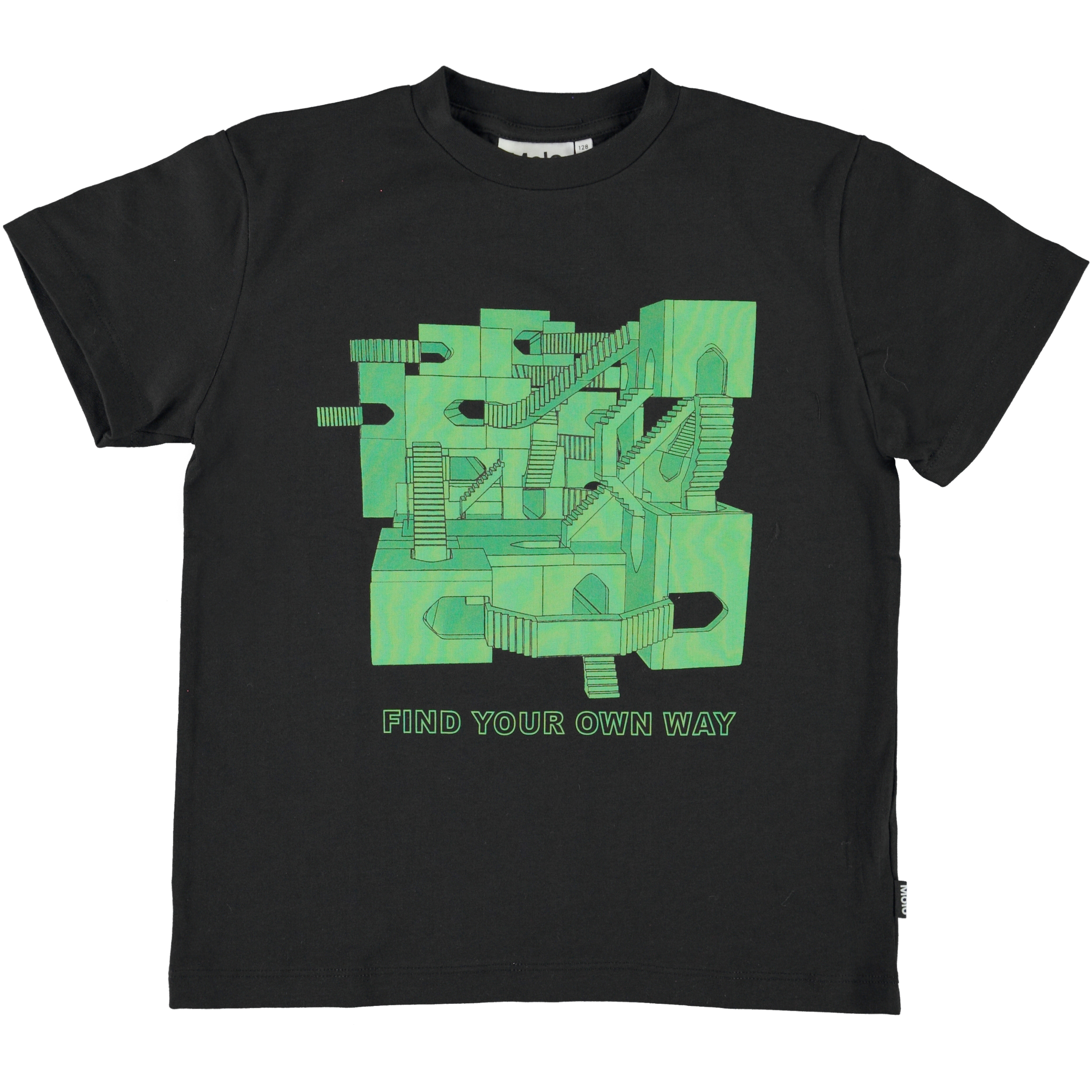 Find your own way' in the neon green print on the front of the Roxo t-shirt. Roxo is a short sleeve black t-shirt.