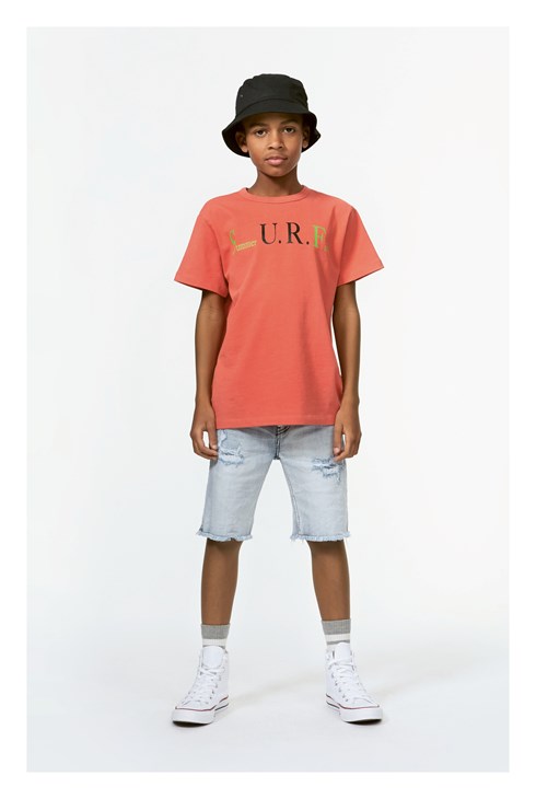 Roxo is a red t-shirt in a washed look with the text 'Surf' printed on the chest. Roxo is 100% cotton and has short sleeves.