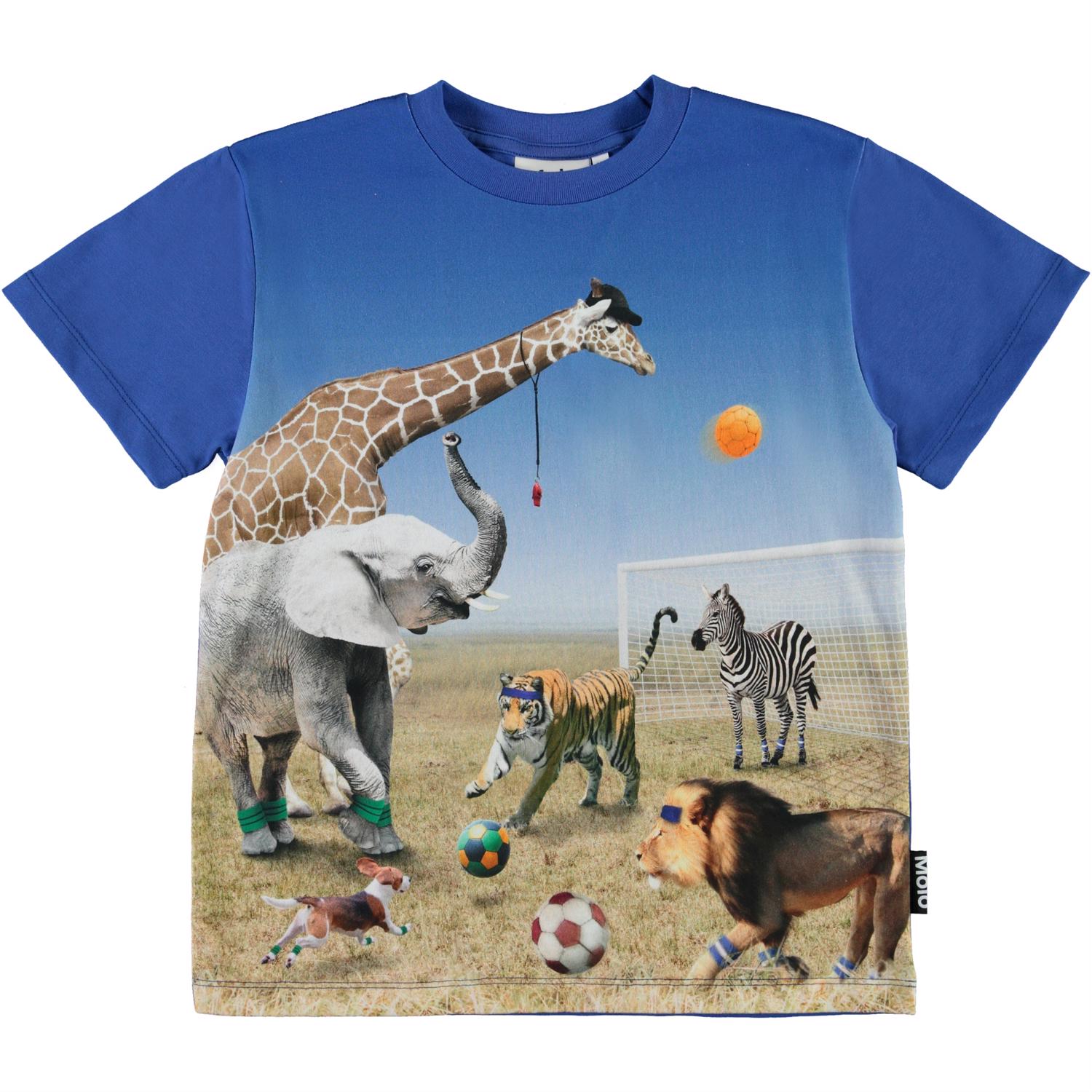 Join the animals of the savanna in a football match on the Roxo t-shirt. The giraffe has the perfect overview and is therefore the ref. Roxo is a blue t-shirt with a round neck.
