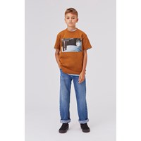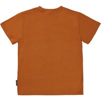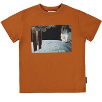 Roxo is a brown t-shirt with a satellite print on the front.